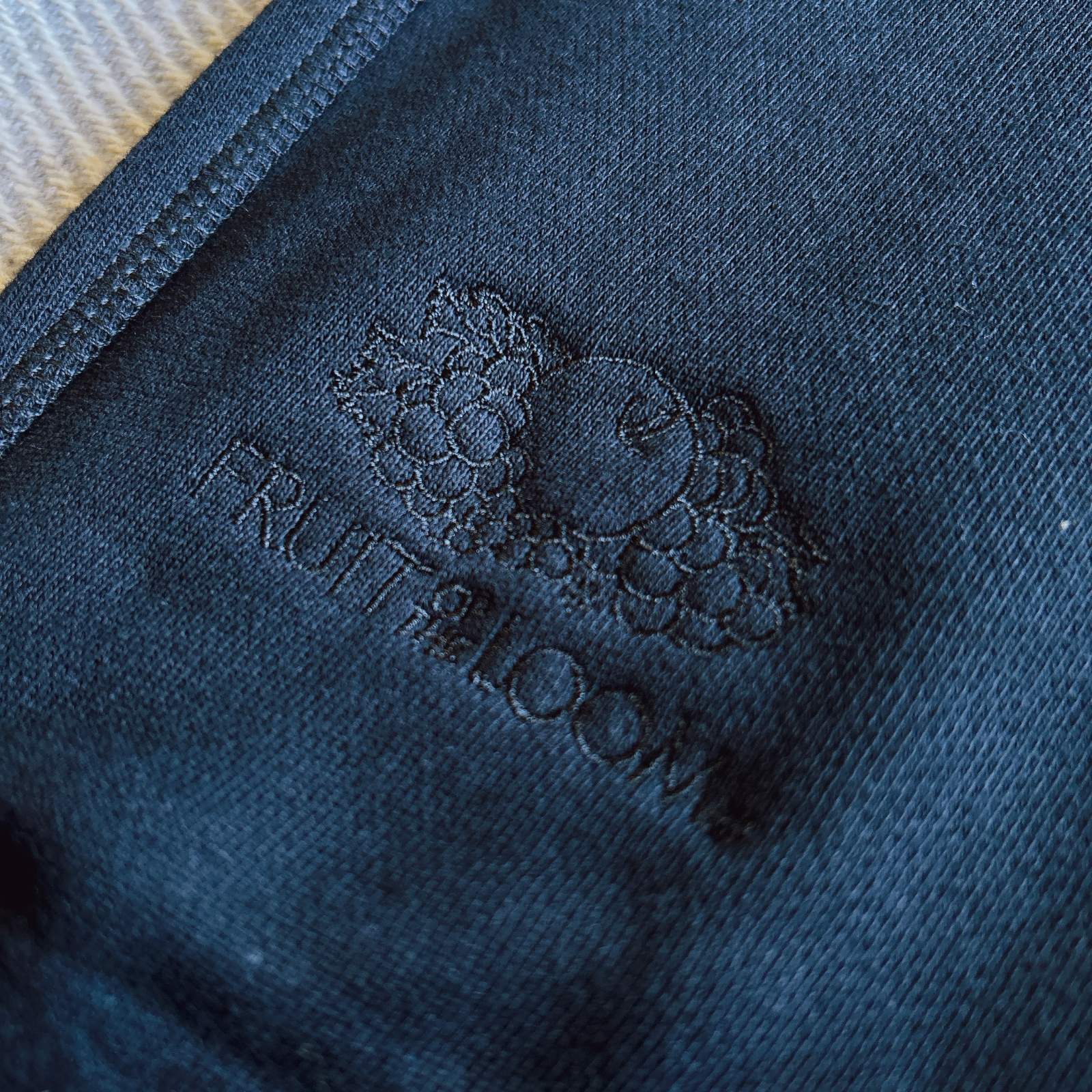 前両見頃に入ったFRUIT OF THE LOOMとWILD THINGSのロゴ刺繍が特徴。