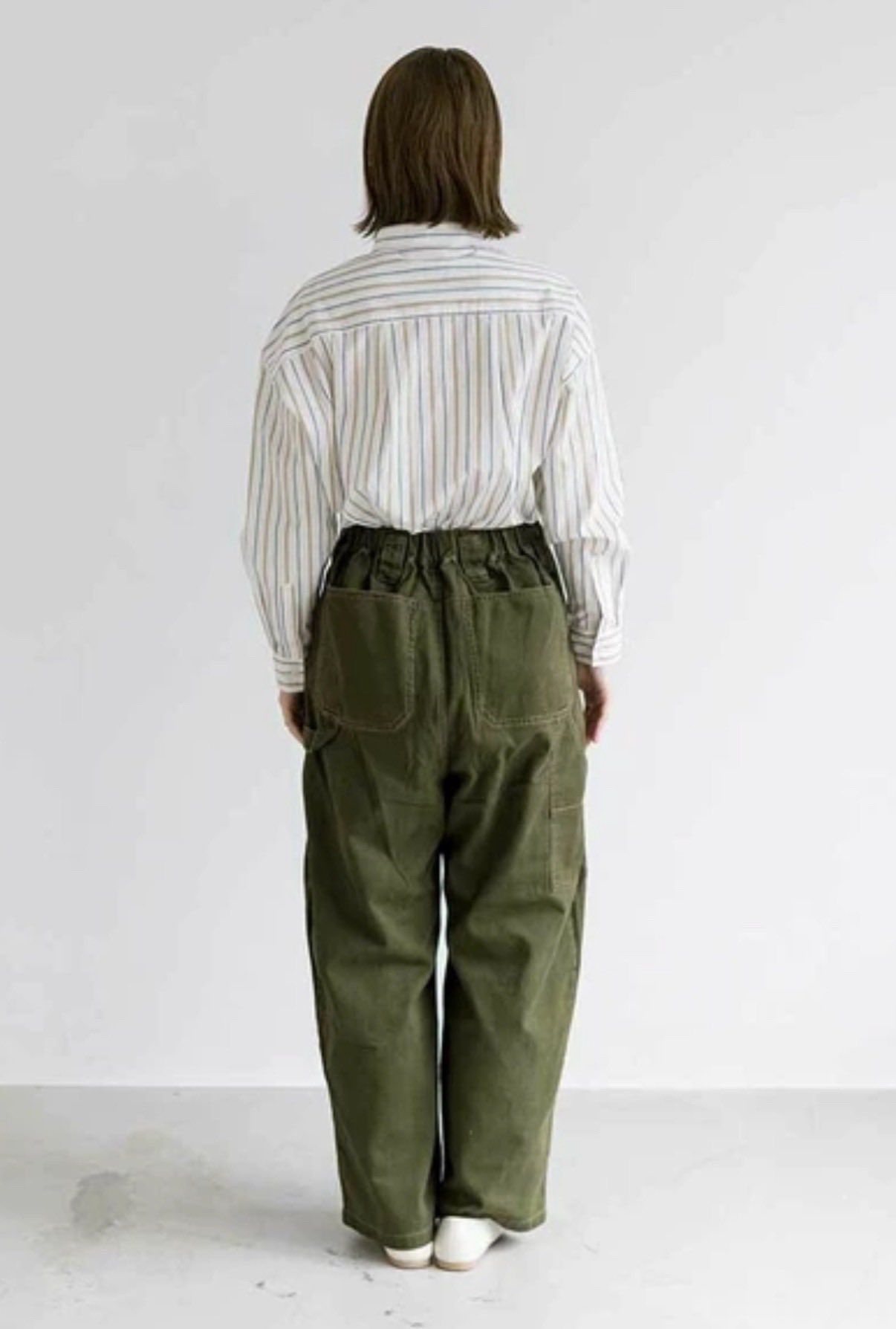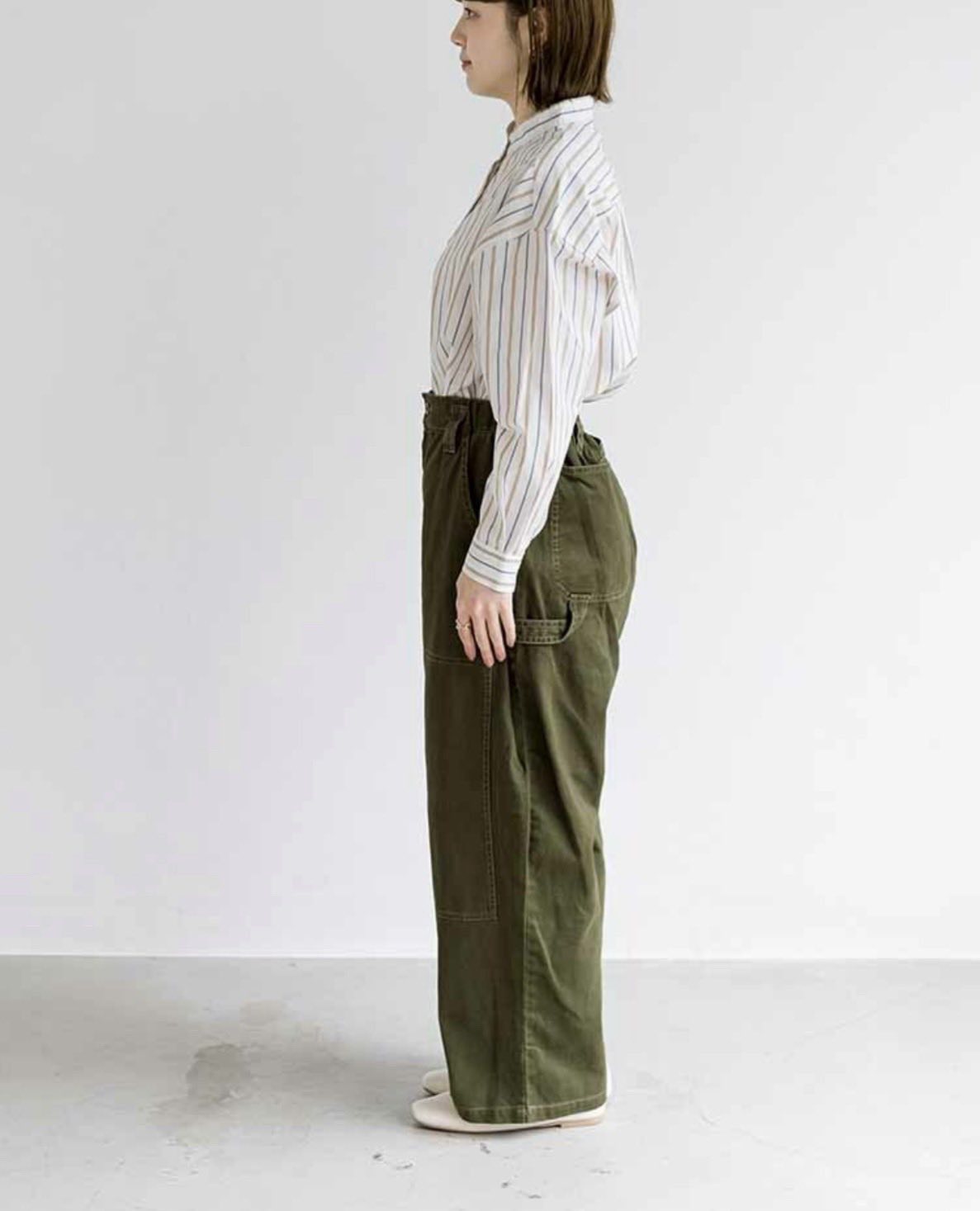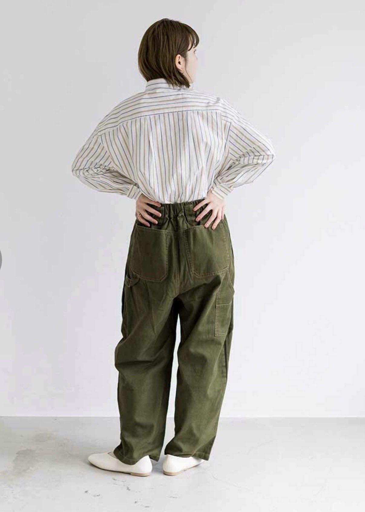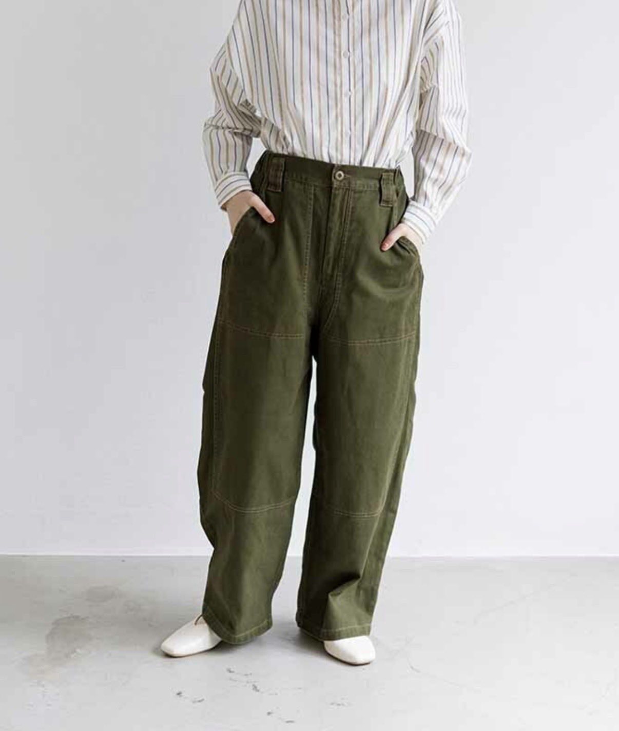太もも周りにゆとりをもたせたシルエットで、ウエストの後ろ部分はゴム使用で動きやすさとリラックス感のあるデザインに。