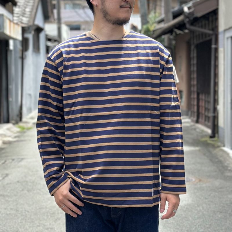 ボートネックの衿ぐりは浅めに設計され、首もとが開きすぎず、すっきりと落ち着いた印象。これまでのバスクボーダーTシャツでよくある悩みのタネだった首まわりの重ね着の悩みが解消された一枚となっています。