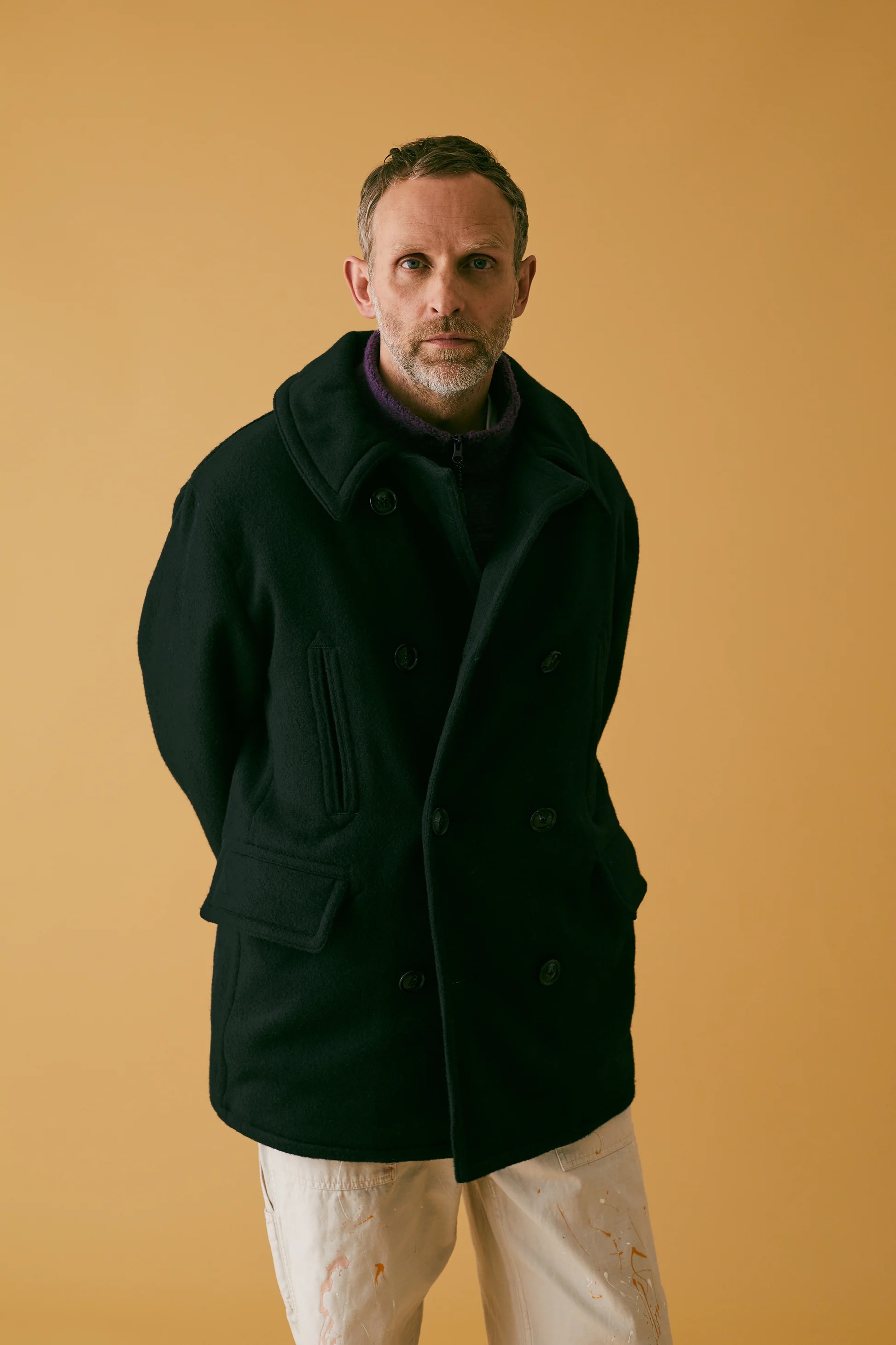 1920〜30年代までに見られたフラップポケット付きのPコートをモチーフにしています。 襟裏に入れたジグザグのステッチや、台襟の5本ステッチなどヴィンテージディテールを再現して男心をくすぐる仕上がり。太番手の糸で縫い上げた唯一無二なPコートに仕上がってます。
