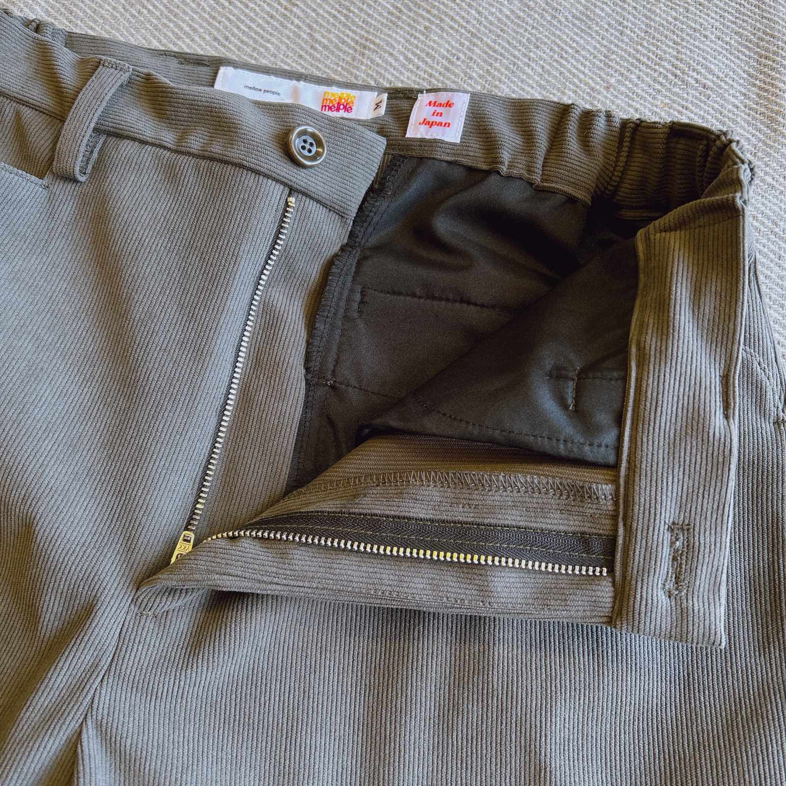右バックポケット上には“Essentials to Relax”のブランドコンセプトとピクトグラムで表したmelpleらしいライフスタイルを表現したmellow lifeタグ付き。